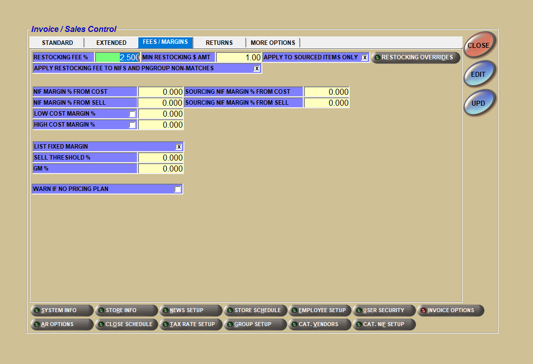 The first step is to set up your LOW COST MARGIN %. This setting is found under the FEES / MARGINS tab in the Controls, Store, INVOICE OPTIONS screen; see sample screen below: