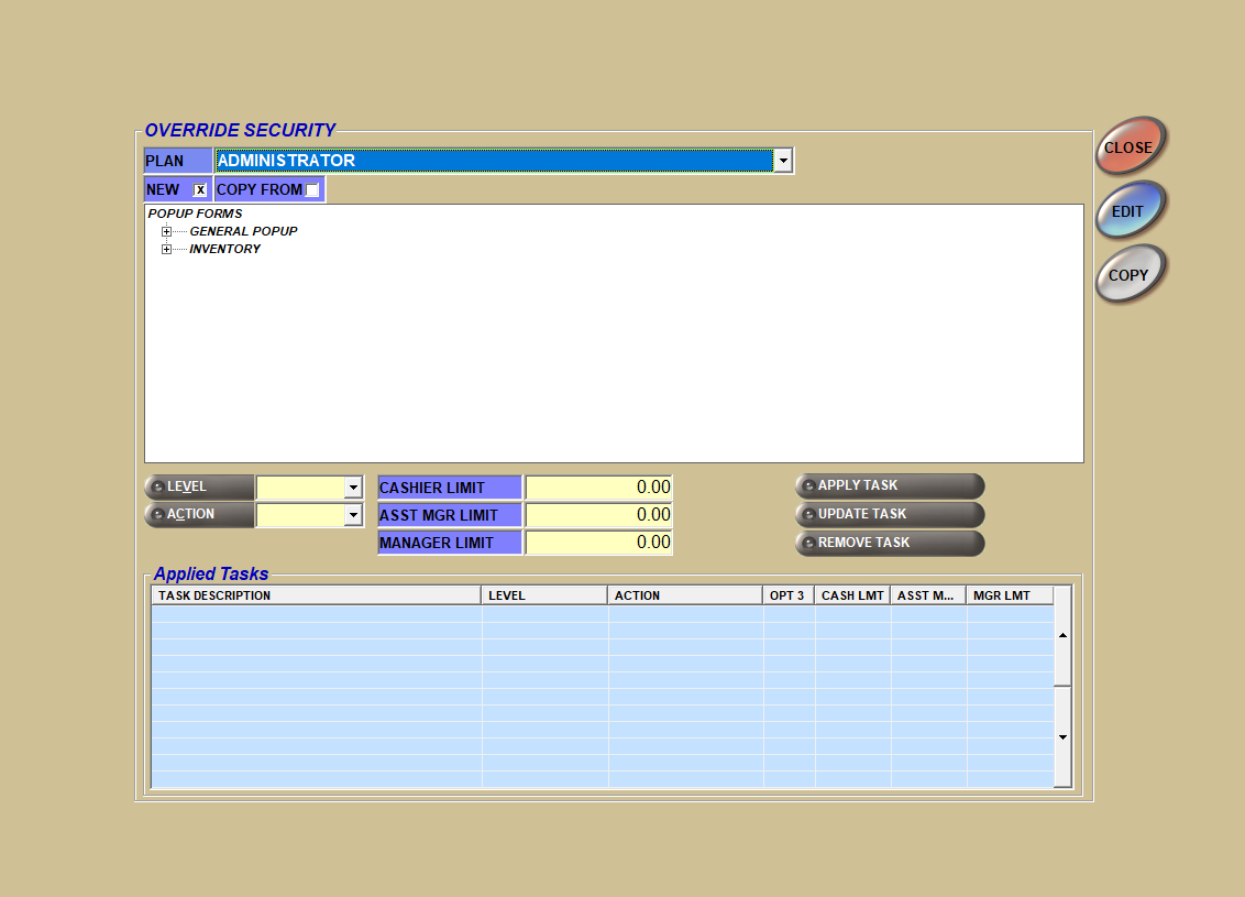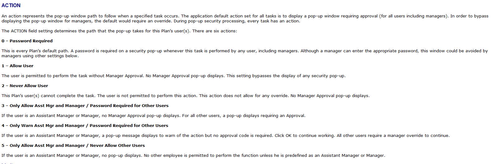 Some managers like to use ACTION 4 instead of ACTION 0. A value of 4 will warn managers (with a pop-up) but requires a password for all other users. You can change an action value by selecting the option from the bottom grid and clicking the UPDATE TASK button.