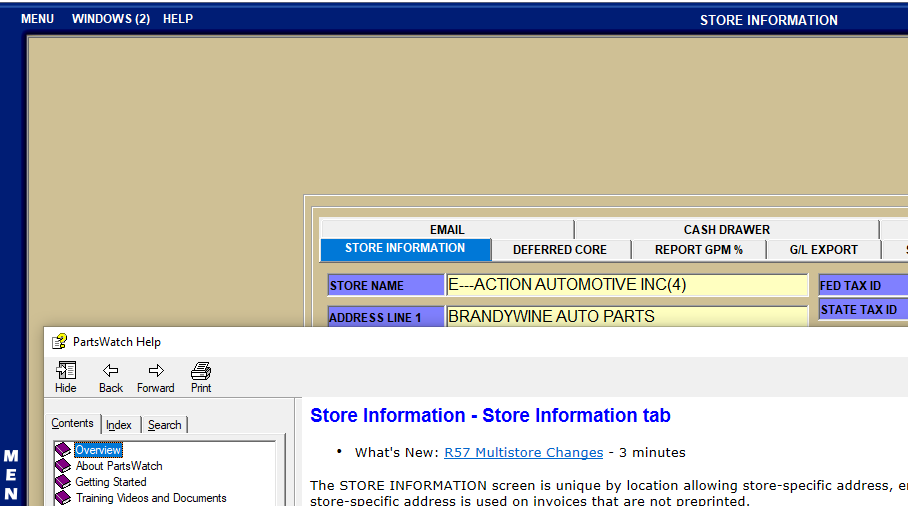 While any of the three screens above are open (e.g. STORE INFORMATION screen), on any tab (e.g. STORE INFORMATION tab), if you press the F1 HELP hot key, the PW Help file opens to that same section (e.g. Store Information – Store Information tab); see sample below: