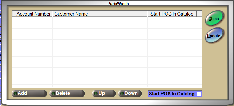 On the EMPLOYEE SETUP screen, accessed from Controls, Store, Employee Setup, PartsWatch has added a new ACCOUNTS button. This button opens a pop-up where employees can add or delete accounts that can be accessed quickly from the INVOICE screen at Point-of-Sale.