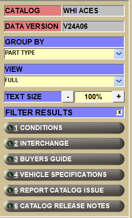 A part menu displays as the first column on the CATALOG and INTERCHANGE screens.