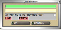 If the ATTACH POS NOTE TO PREVIOUS PART checkbox is unchecked, the following window displays, prompting you to not only type the note but also to identify which part on the sales order the note will be attached to, either the previous part entered on the sales order or no part at all. Note: The LINE and PART # fields will automatically populate with the previous Line and Part # if a part was already added to the sales order.