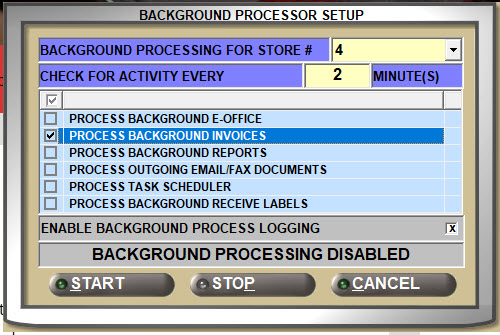 You can turn on the BG Processor in the BACKGROUND PROCESSOR SETUP pop-up, accessed from the Menu, PC Setup, Set Bkgnd Process.