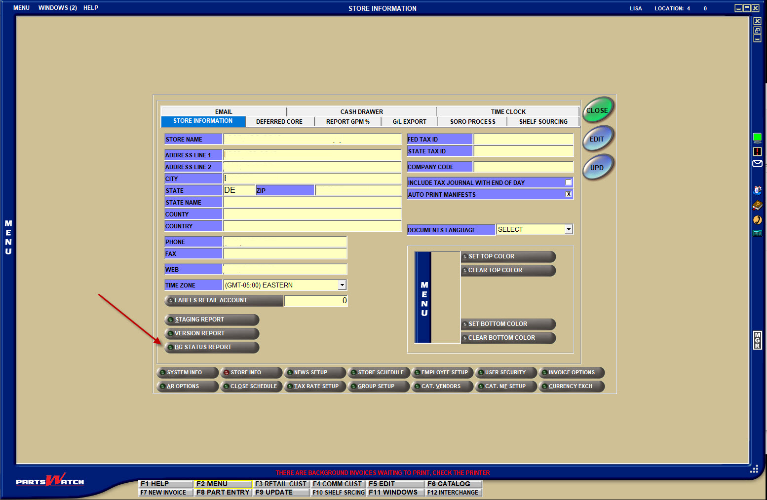 The BG STATUS REPORT button can be found on the STORE INFORMATION screen, accessed from the Menu, Controls, Store, Store Info, and allows you to run a report to see any background processor activity you may have set up.