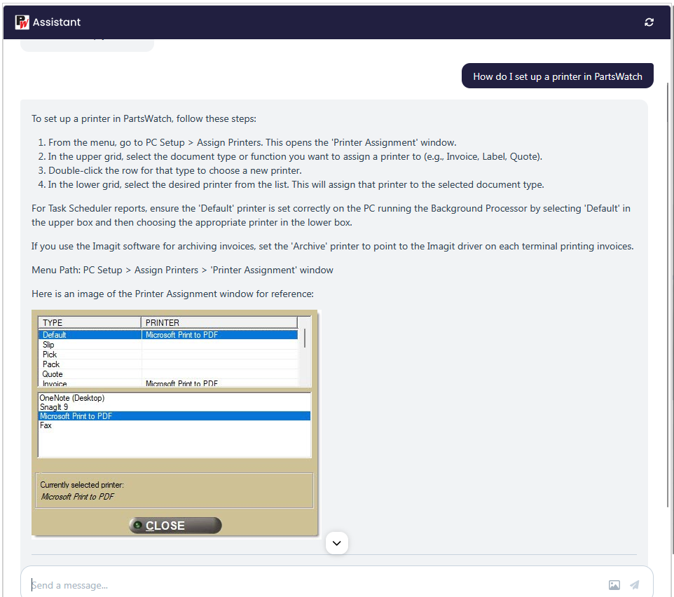The following screen will open in your browser, allowing you to ask the AI about anything you might need to know about PartsWatch.