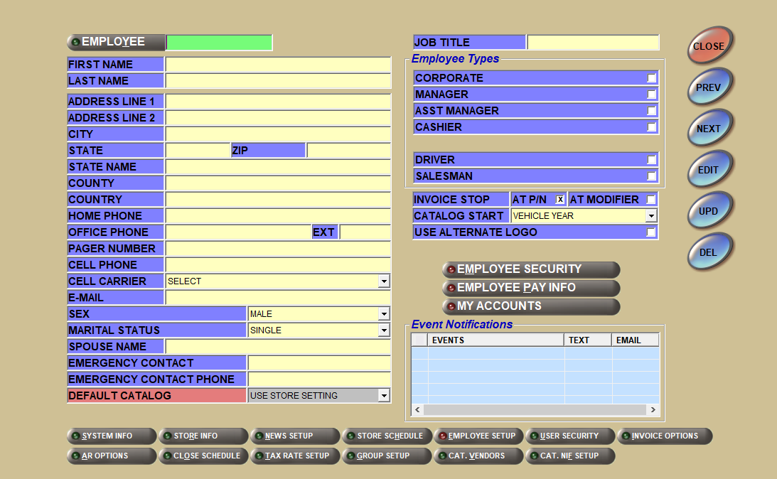 All of the setup is performed on the Controls, System, EMPLOYEE SETUP screen; see sample screen below: